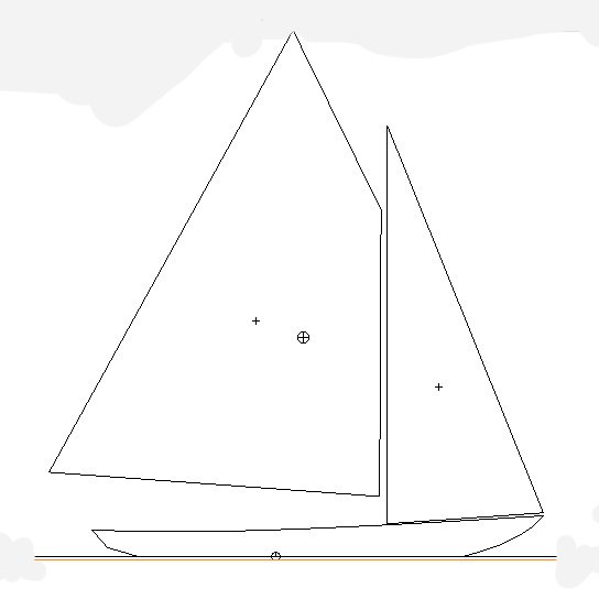 The following drawing is a screen plot of the above Sail points and Hull Characteristics in graphic form. Shown are the Center of Effort of the Sail-plan and the Location of the Center of Laterial resistance.
