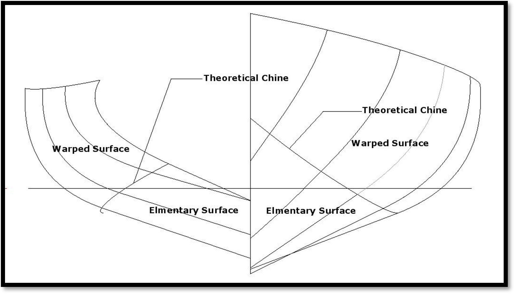 In a Double surface design, the upper warped surface runs from the sheer-line, around the turn of the bilge to a theoretical chine line. The bottom Developable surface then picks up at the theoretical chine line to the center line of the hull.